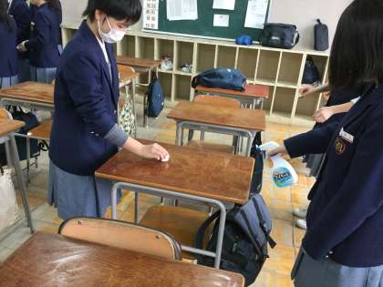 教室の壁面の汚れをふき取り、黒板周りの掲示物の跡をきれいに削り取っている生徒もいました。移動させて床面のゴミを掃除機やほうきできれいに取っていました。また教習用の机を洗剤を付けて拭き掃除のグループもありました。