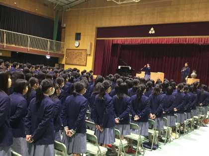 3年生の卒業式練習が、昨日より始まりました。体育館は暗幕が閉められ、長椅子の並びは男女に分かれての配置です。体育館に流れる空気には、いつもとは違う式典の厳かな雰囲気がありました。