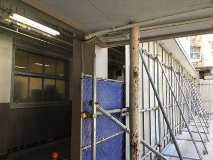 2月23日のこのホームページで中庭の周りにに塀が完成しました。塀の校舎側は天井近くの高さまでパネルが貼られています。景色をも写す高反射の白いパネルではありますが、いくぶん薄暗くなりました。