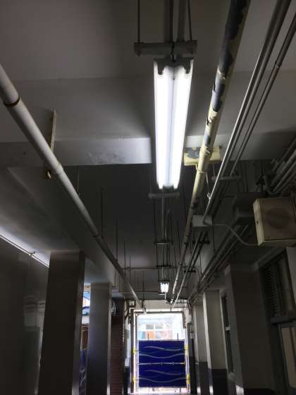 照明の増設をお願いしましたところ、本日40wの蛍光灯2本入りの器具を、天井2か所に設置していただきました。廊下だけでなく、教室内も明るくなり助かります。