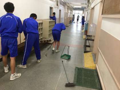 1号館1階のミーティング室前の廊下では、廊下に置いてあるものを移動して、隅々まで丁寧に掃きだしていました。靴箱も雑巾で丁寧に拭いてくれました。男子トイレではタイル面に水を張り、デッキブラシで何度もこすり、きれいな生地のタイルとなっていました。3号館1階の中廊下では、通常置いてあるすのこを取り外しての床清掃でした。