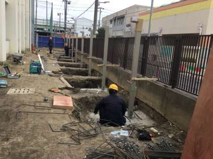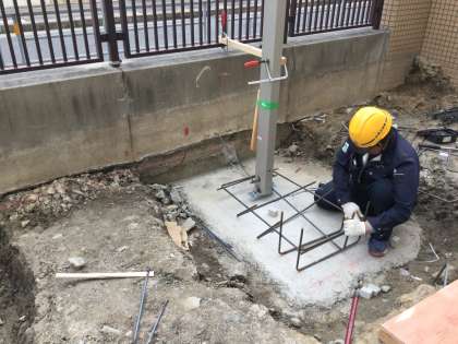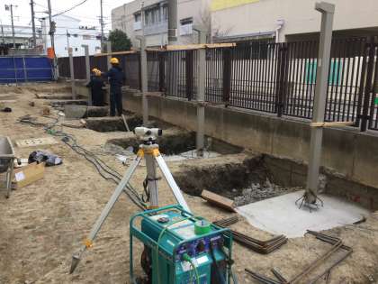 3月6日にショベルカーで基礎部分の穴が掘られ、以後コンクリートの打設がありました。今日は基礎コンクリートに支柱を取付る配筋作業と、溶接作業が行われています。地上部分が形として現れてきました。
