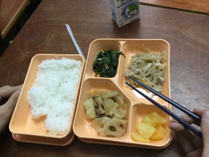 今日の給食メニューは、豚肉のしょうが焼き、一口ごぼう天と大根の煮物、ホウレンソウの煮びたし、パインアップルの缶詰でした。「デリバリー方式による給食」の生徒は10人ほどで、「家庭から持参する弁当」を選択した生徒が多いようでした。