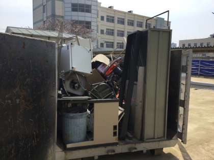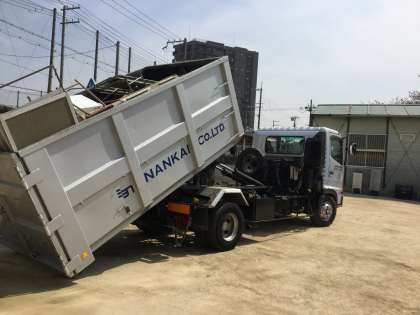 北門近くの集積場に、大型の粗大ごみ回収用のアームロール車がやってきて、コンテナを地面に降して作業開始です。壊れたロッカーや破損した机などの廃棄物が、コンテナに積み込まれていきました。コンテナはアームで引っ張られてトラックの荷台に載せられて運ばれていきました。