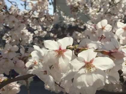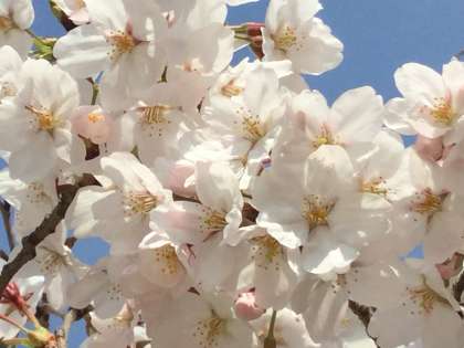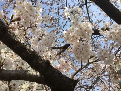 手が届く高さにある枝では、満開の花びらがびっしり並び枝が重そうにしなっていました。太陽に照らされた花びらの淡いピンクと、黒く太い幹との対比が何とも言えぬ趣があります。