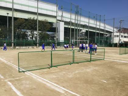テニス部は午後の活動で、後方に満開の桜を眺めながら、硬式ボールを打ち返したいました。プレーではフェンスすれすれのボールを打ち返す場面もあり、今後ネットとしての効用が期待されます。