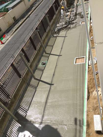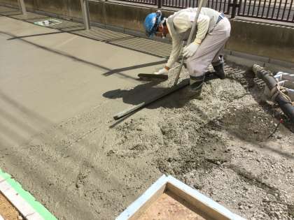 パイプで送られてきたコンクリートが型枠の中に慎重に納められます。木製のT字型のレーキできれいにならされ、全面的にコテで仕上げられました。