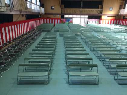 イスは等間隔に並べられ、長椅子・折りたたみ椅子・丸椅子とそれぞれがきれいに並べてありました。