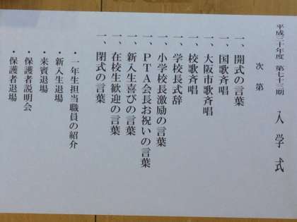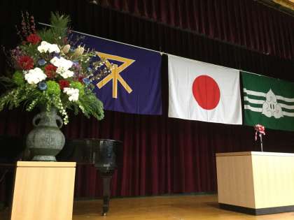 舞台横の壁面には、長身の先生に式次第を掲示していただきました。管理作業員さんにより舞台上に旗が掲げられ、マイク等も準備され、午後には花屋さんに盛り花を活けていただきました。