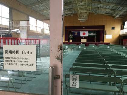 早朝の玄関と式典会場の体育館の様子です。人気のない体育館では静かに、式典の開始を待っています。