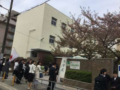 正門わきの桜は、大急ぎで花びらを落しわずかばかりの花を残して、本日の入学式を迎えました。