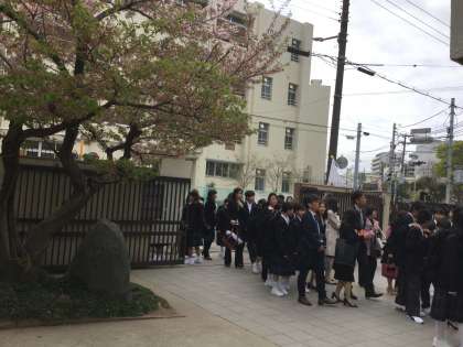 8時前には、正門前では入校前に記念撮影をされる方も多く、順番待ちをされている方も見かけました。桜を背にした看板、大活躍の始まりです。
