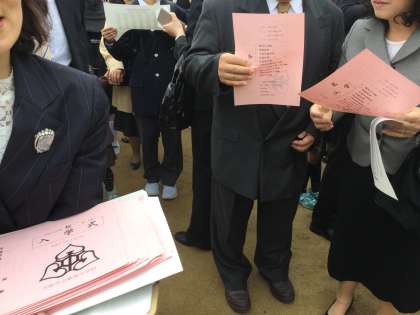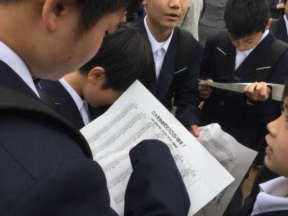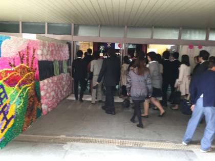 新校舎建設工事のため、仮設の渡り廊下を通って4号館前のグランドに入っていただきました。入学式に先立って、組分けの発表がありクラス名簿のプリントが配られました。