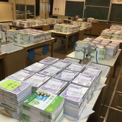 学年別・クラス別に仕分けして、テーブルにうず高く積まれています。