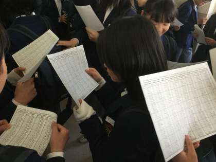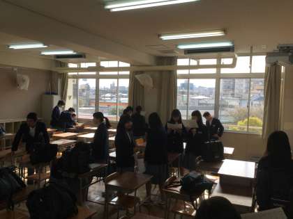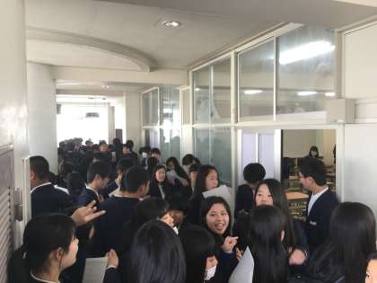 3年生は1号館3階の廊下にてプリントが配付されていました。生徒達はクラスを確認した後も、廊下は大渋滞となりました。名簿を確認後、先生方の誘導できれいに整備された教室に向かっていきました。教室内でも各所で集まり会話が交わされていました。