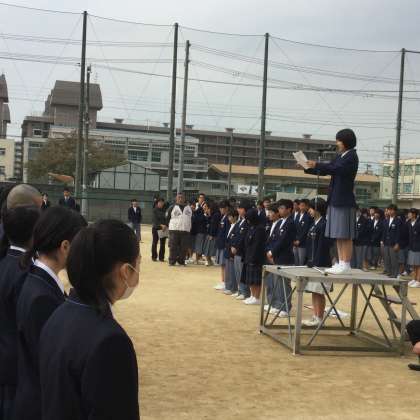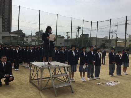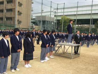 グランドで2・3年生徒と新入生が相向き合うかたちで対面しました。