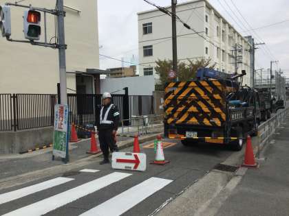 4月9日(月)より3日間の予定で、歌島中学校と歌島小学校の間の道路が、昼間全面通行止めにして工事が行われています。