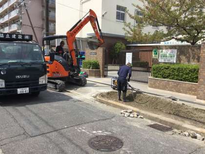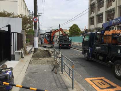 正門前の歩道のアスファルト舗装や縁石を、ショベルカーやダンプカーを利用しての撤去作業です。正門の開口部の幅を広げる工事です。