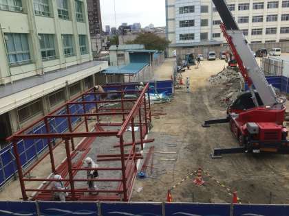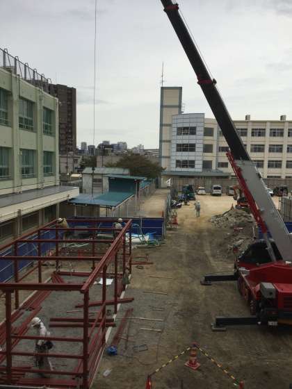 鉄骨の組み立ては急ピッチに進められていきました。午前中には建物の骨格は出来上がってきました。午後に壁面になる鉄骨も組み立てられて、体育倉庫らしい建物となってきました。