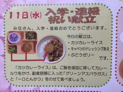 3号館入り口横の掲示板に、「大阪市中学校給食の献立」が貼ってあります。4月11日(水)の給食メニュー欄には、注目献立「入学・進級祝い献立」とありました。