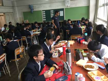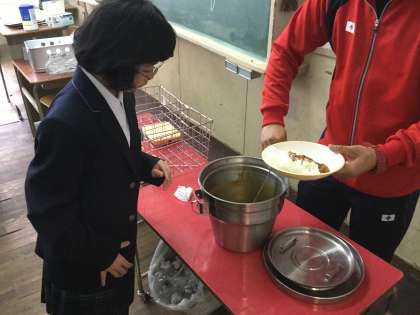 昨日から給食が始まりました。1年生の教室では、担任の先生に食缶から生徒が一人一人分けていただいていました。生徒の机上に準備されている実際の給食を撮影させていただきました。生徒達に人気のカツカレーライスにぶどうゼリーもついていました。