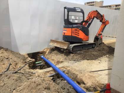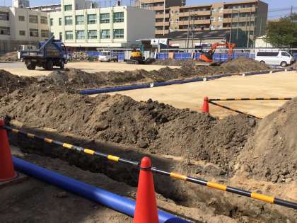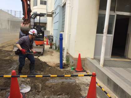 溝の掘削は工事用の塀を越えて、1号館まで掘り進められました。塀の近くでは、側溝や各種パイプの下を水道管が埋められ、最後に1号館の壁面に立ち上げができました。