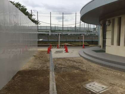 ピロティー前の塀(高くて白いフラットパネル)が、1号館建物の端まで延長されます。上の写真では右側のブルーのフェンスから、壁面左の青色のタイルまで延長されます。