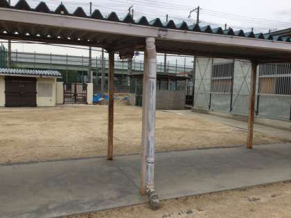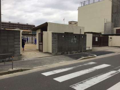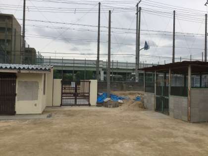 グランドに設置されている、ブルーのガードフェンスが、渡り廊下を越えて、ゴミ置き場まで設置されます。同時に第2グラウンドに通ずる7号門(下の写真では開いている小門)も閉鎖されます。