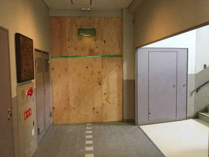 朝イチで、1号館1階廊下のプール側の出入り口がコンパネで閉鎖されました。