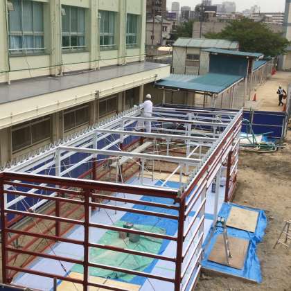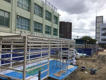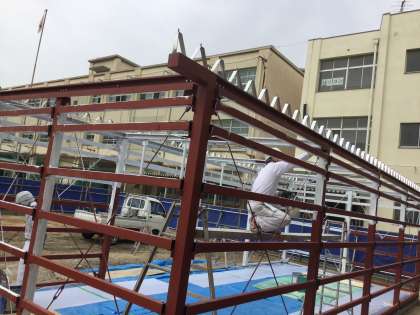 この体育倉庫の鉄骨は、赤茶色のサビ止め剤が塗ってありしたが、今回白色のとりょが刷毛で塗られていきました。塗装後は艶のある純白の塗料が、鮮やかに光を跳ね返していました。