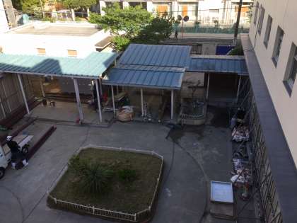 モルタルの撤去作業は昨日で終了となりました。今日は全体を覆っていた防音シートやフイルムなどがはがされました。1年生生徒が眺めている3号館から見た眺めでは、渡り廊下は柱と屋根だけになっていました。