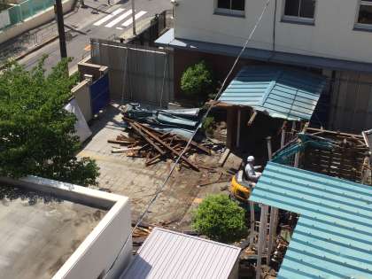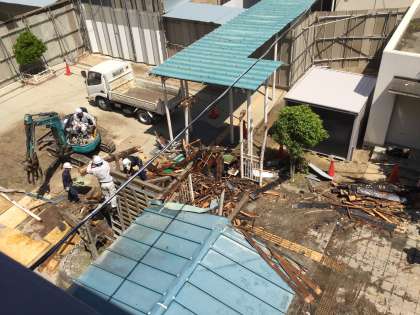 初夏の様な天候にも恵まれて、解体作業は予定どうり進んでいきました。重機は中庭側からも解体を行い、お昼前には中央部の屋根がなくなり、重機の力強さに驚くばかりです。