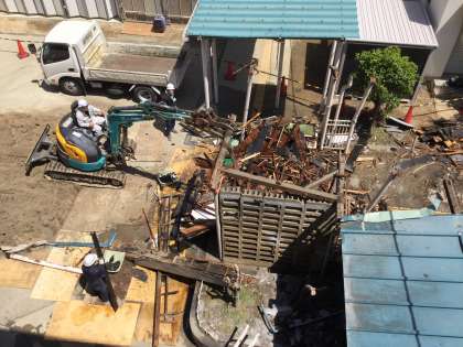 上の方から作業現場を見ると、まるで爆撃でもあったかのように材木などの部材が多く積み上げっていました。