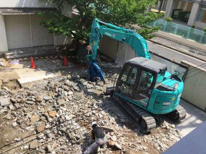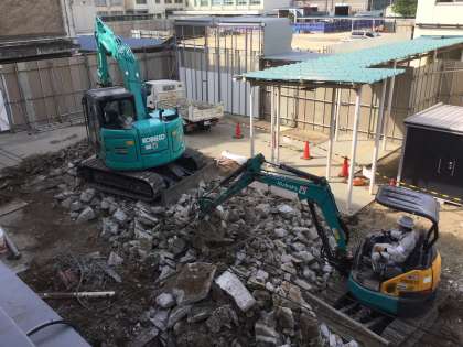 正門前の渡り廊下の地上部分は、先週解体され撤去されました。撤去後に正門前の地面のコンクリートが重機ではがされていきました。