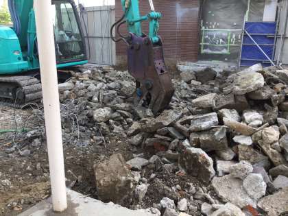 掘り出した大きなコンクリート塊が積み上げられて、山となりなっています。コンクリートの塊は、重機の先端に取り付けられたかにばさみで一つずつ噛み砕かれて、小片と細かい粉と化していきました。