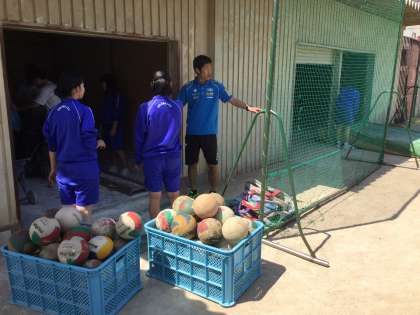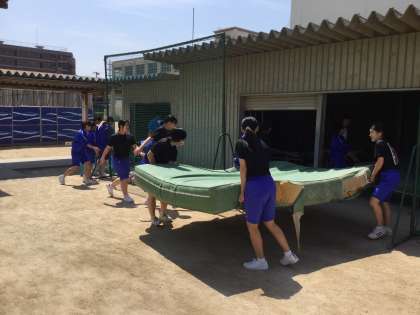 体育倉庫が完成して、学校へ引き渡しがありました。家庭訪問期間中のため午後は部活動となり、バレーボール部員の協力で、物品移動を行いました。