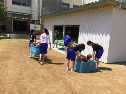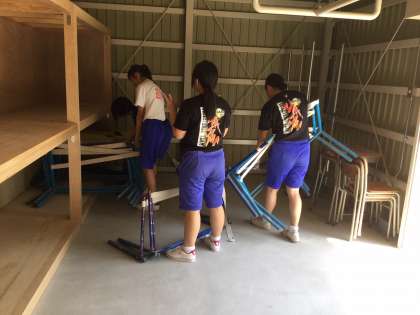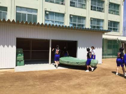 新体育倉庫には、奥に3段の木製の棚があり、カゴ等が収納しやすくなっていました。高跳びのウレタンマットが多くあり、重ねて高く積み上げられていました。陸上のハードル等は下の段に納められていました。