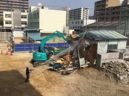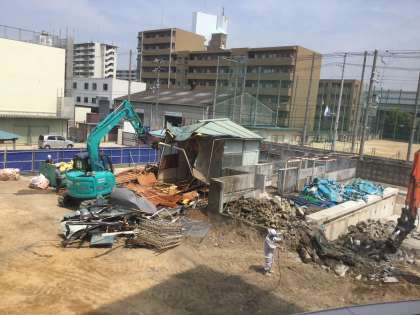 連休の谷間にあたる5月1日(火)、プール関連倉庫の解体が朝からありました。