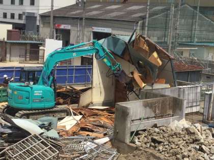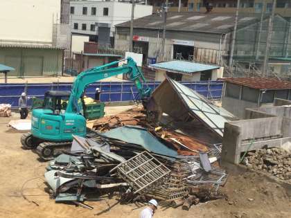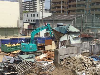 重機の圧倒的な力で、小屋はどんどん破壊されていきます。昼前にはもぎ取られた建物は、立っている柱などがなくなり、崩れ落ちるように地面に伏せられていました。