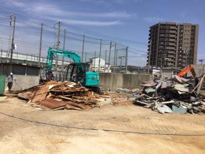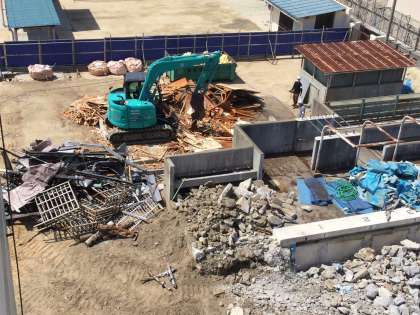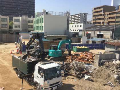 半日で廃材の山となった倉庫は、操縦士が重機を器用に操って、きれいに分別されています。午後には大型のトラック2台が現れ、金属と木材に分けて積み込まれて搬出となりました。