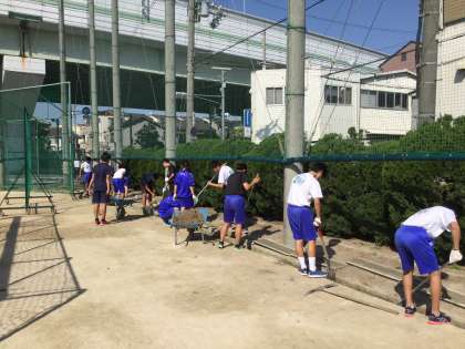 グランドを使用している部活動の生徒たちが、グランド周りの側溝に溜まった土を取り去る整備作業です。梅雨時期前にして、スムーズな排水ができ良好なグランド状態を保つための作業です。今年は新校舎建設工事の関係で、1か月早めの作業としました。