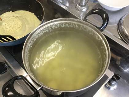 いももちづくりでは、じゃがいもを丁寧に皮をむき鍋でゆでてていました。