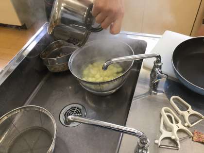 ゆであがったじゃがいもをつぶし、冷めてから片栗粉を混ぜてからさらに練っています。