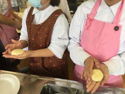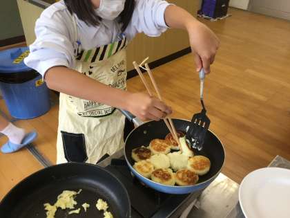 餅のように丸く成型してから油を引いたフライパンで焼いていました。途中でフライ返しでひっくり返して、両面ともこんがりと焼きあげられていきました。