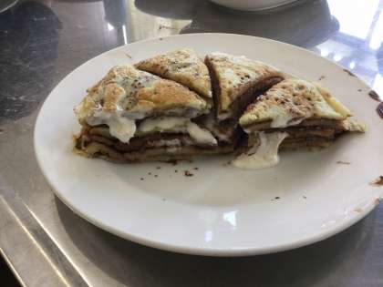 複数のクレープとともに、ホイップクリームやベリーの実がバランスよく配置されています。何段にもクレープを重ねて、先生にチョコレートケーキも作っていただきました。