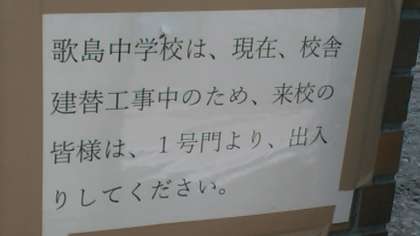 校舎建て替え工事が始まって約2ヶ月になりました。いまでも、電話問い合わせがありますので、載せておきます。ホームページトップの写真の正門はまもなく工事車両、給食や牛乳のトラックの出入口になりますので、出入りは、できません。現在、正門の左側、北之町公園側に、2号門、正門の右側30メートルのところに、1号門を設置しています。2号門は、平日の1・2年生の登下校時のみ使用しています。1号門は、3年生の登下校時、部活動終了時の生徒の下校時に、使用しています。通院後など遅刻して登校する場合、保護者の方が、来られた場合は、1号門脇門のインターホンを押してください。門は、自動では、ありません。応答があれば、門扉を押してお入り下さい。