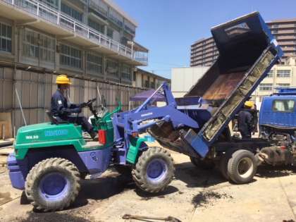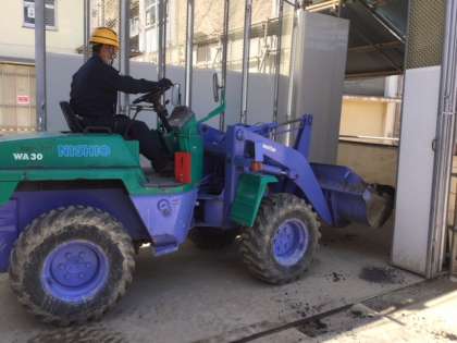 3号館横の仮設の渡り廊下の舗装では、ダンプカーで運び込まれたアスファルト材を、バッケト車で受け取り、渡り廊下に運ばれていきます。渡り廊下の幅いっぱいのバケット車をいとも簡単に操る運転技術に感嘆してみていました。