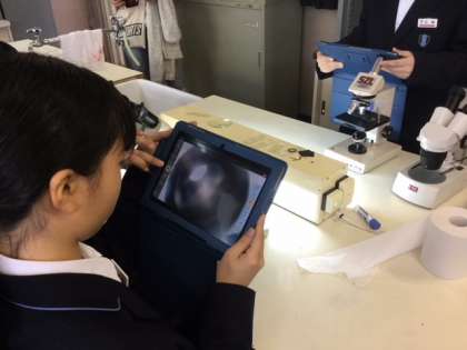 双眼実体顕微鏡で、プレパラートのプラナリアを見るものです。プラナリアは小さな生きている生物で、顕微鏡で見ていると動く様子がよくわかりました。またタブレットでプラナリアを写して確認もしていました。