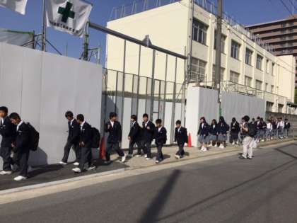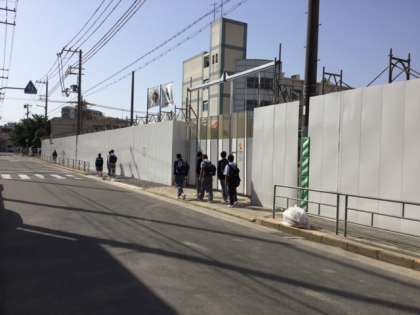 5月15日(火)の生徒達の登校時の様子です。6号門があった道路沿いは、フラットパネル(白く背の高いパネル)に囲われました。