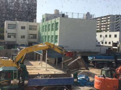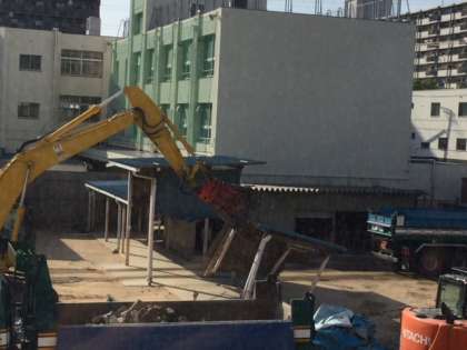 渡り廊下の解体では、頑丈な角パイプでできている渡り廊下の屋根を、斜め上から押していきまました。簡単にひし形に変形し、次の一手でちゃぶ台返しのように転がっていきました。背の高い車両も通れる屋根さえも、上の方からひっぱって解体していきました。